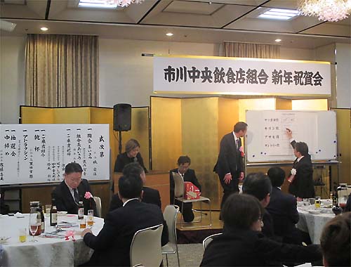 新年祝賀会で、抽選会の準備をする役員たち